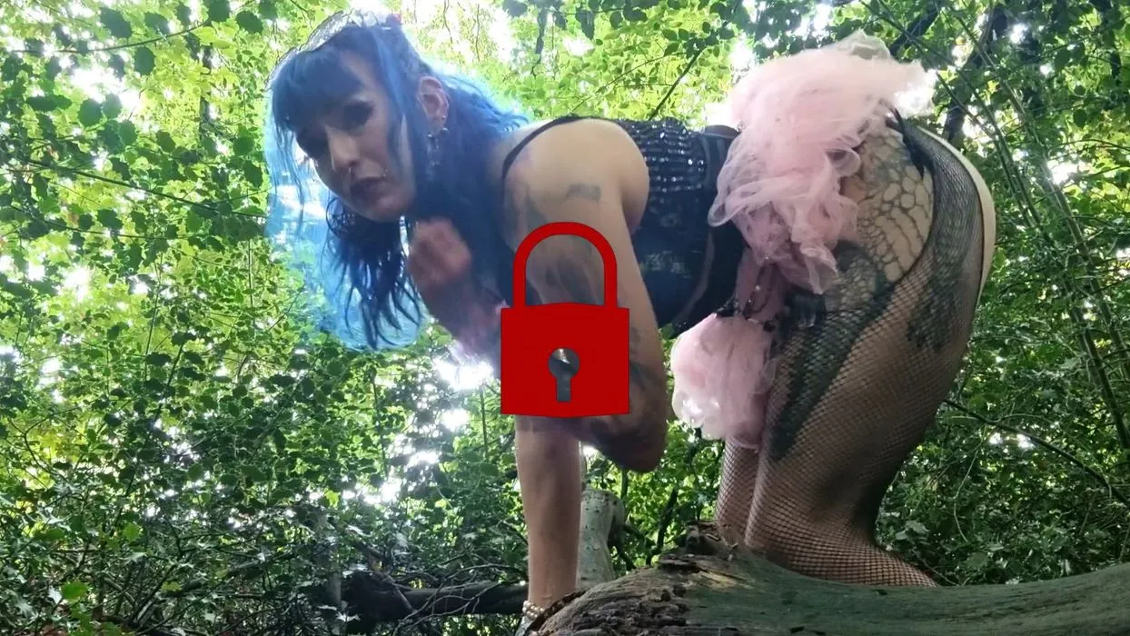 GOTHGIRL WITH CREAMY PUSSY RIDES RUBBER DICK IN THE WOODS!